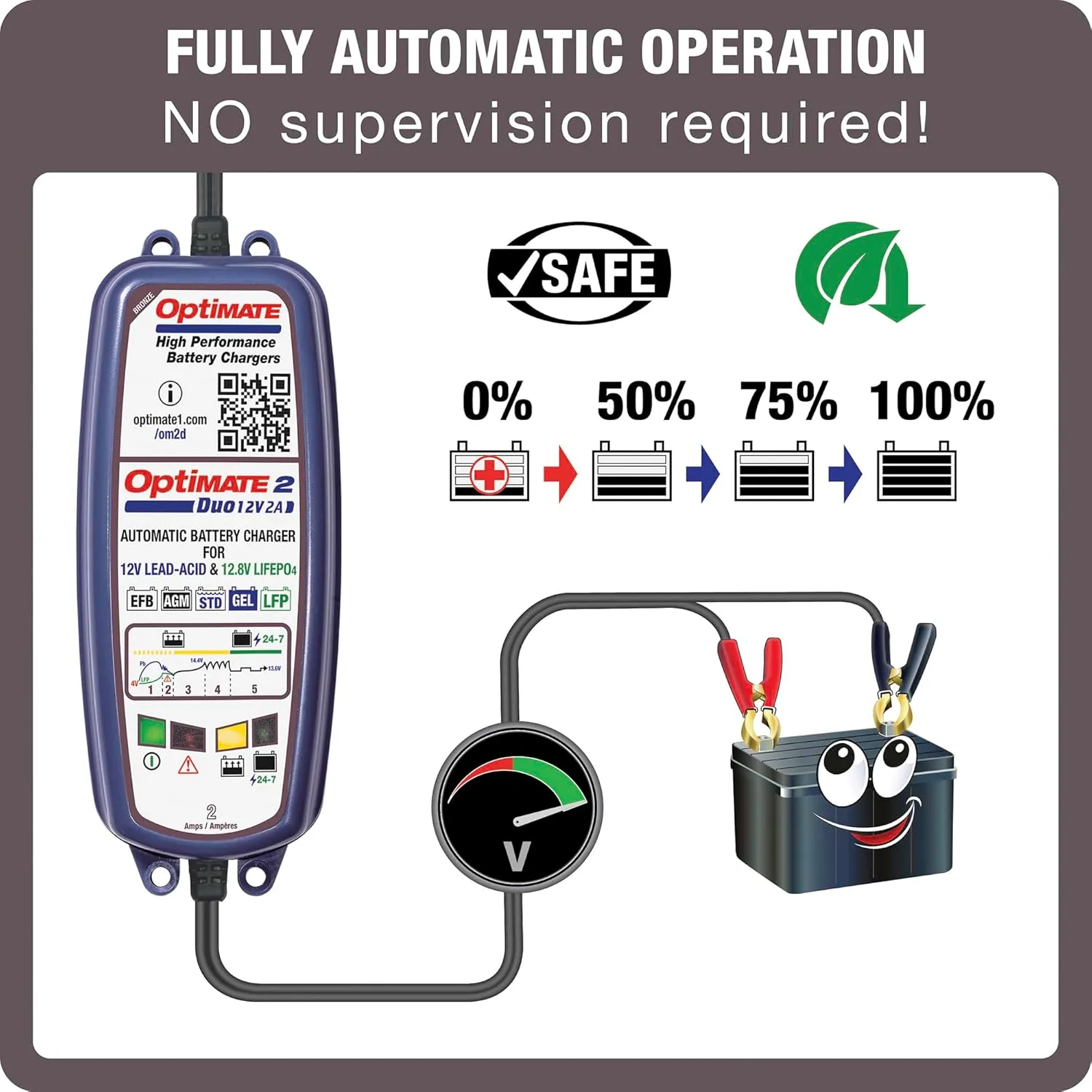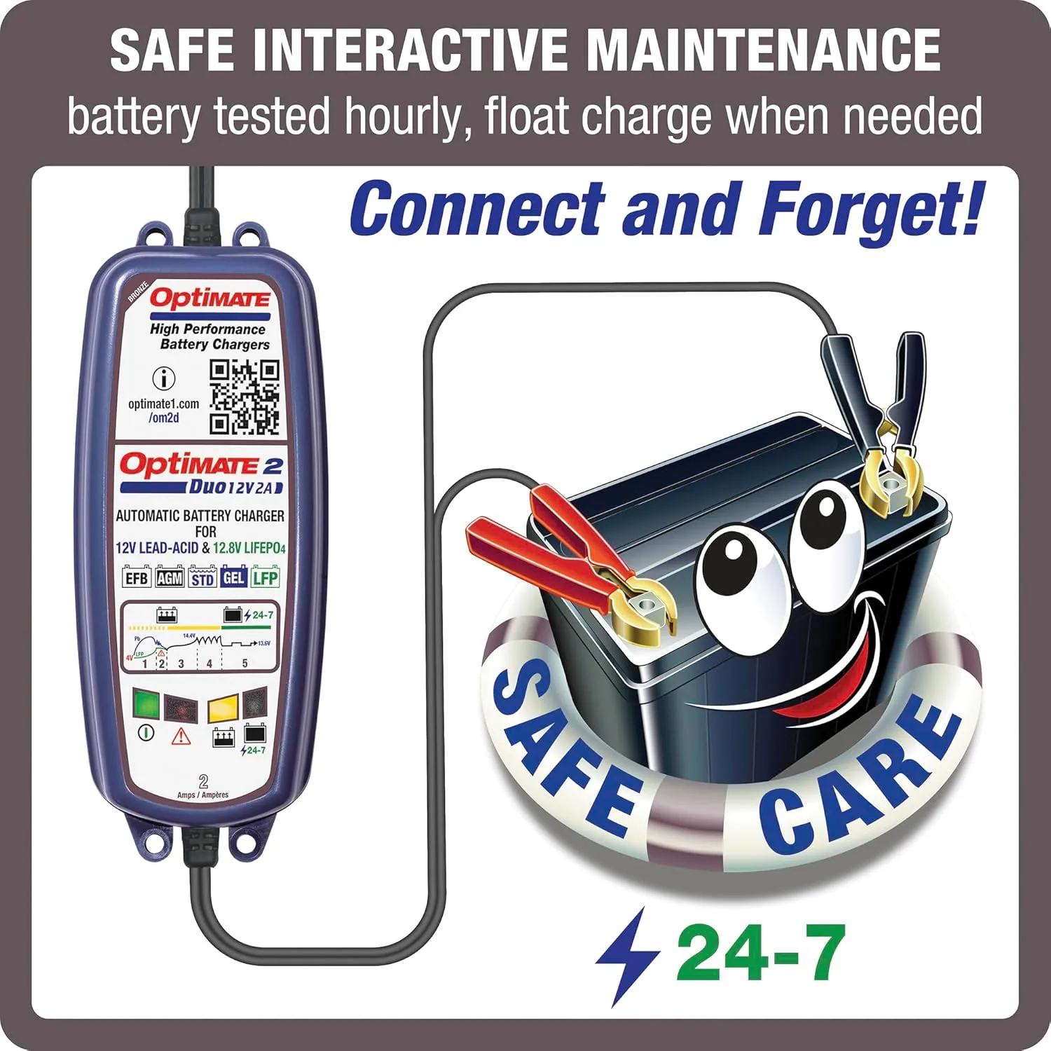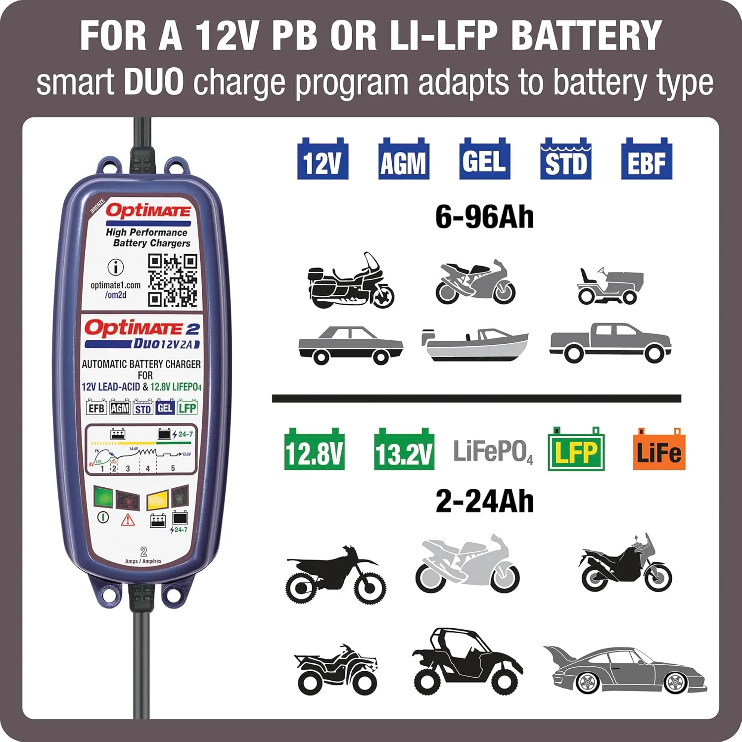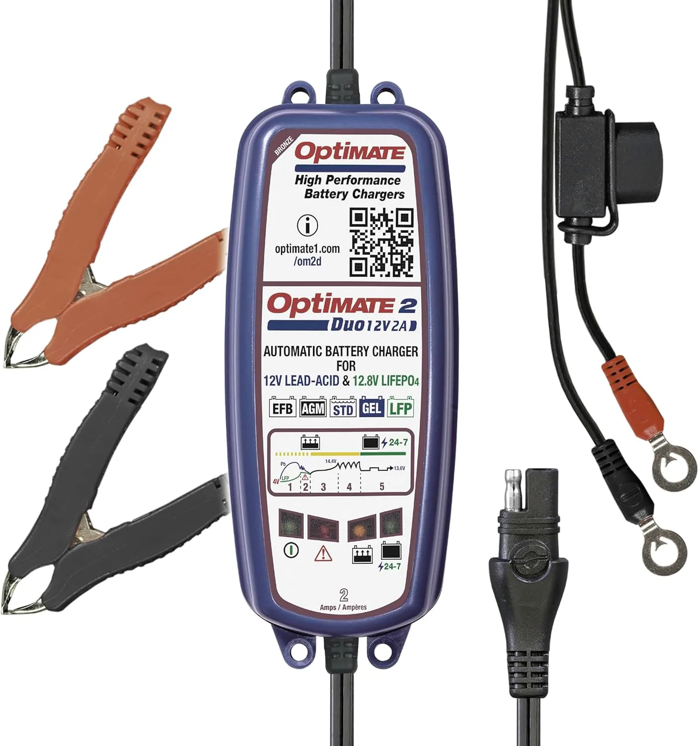 - OptiMate 2 DUO is the ‘ALL IN ONE’ general purpose battery charger and maintainer that assures batteries are always ready to perform. automatically adapts to the connected battery type – Guarantees healthy lithium or lead-acid batteries!