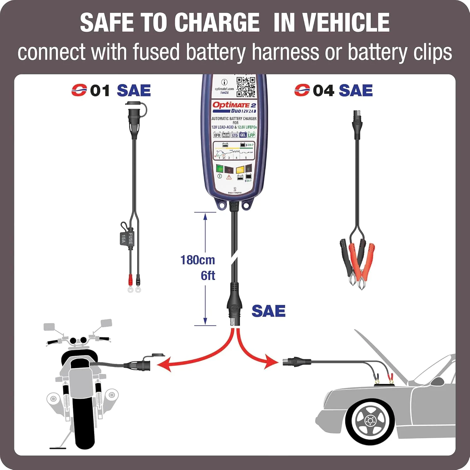 - Safe to charge in vehicle with provided O-01 fused battery harness lead or O-04 battery clips. No risk of overcharging. Totally safe for vehicle electronics. Sparks suppressed. Safe for long-term battery maintenance. Automatic shut-down if short-circuited or battery disconnected.